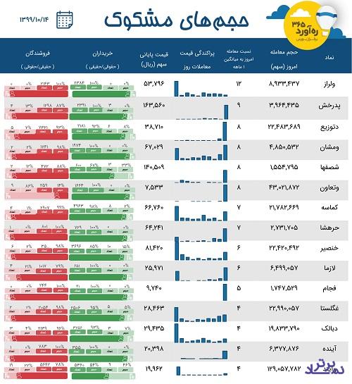 در این میان، بررسی اطلاعات پردازش اطلاعات مالی مبنا نشان داد 15 شرکت با داد و ستد 12 تا چهار برابری نسبت به میانگین یک ماهه در زمره معاملات مشکوک قرار گرفته اند.