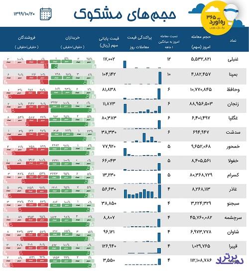 در ادامه هم شرکت های تولید برق عسلویه مپنا، بیمه حافظ، کشاورزی و کود زنجان، پگاه گلپایگان، سیمان دشتستان، محور خودرو (زیرمجموعه ایران خودرو)، خدمات فنی فولاد یزد، پارس سرام، کشت و صنعت پیاذر، سیمان بجنورد، سرمایه گذاری مس سرچشمه، پالایشگاه لاوان، قند پیرانشهر و سرمایه گذاری صنعت بیمه مشمول معاملات مشکوک امروز شدند.