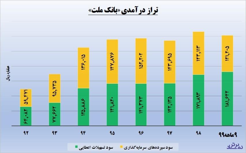 به این ترتیب، تراز درآمدی بانک ملت باز هم مثبت ماند و بهتر از گذشته عمل کرد. همانطور که در تصویر ذیل مشاهده میکنید، فاصله دو قطب مثبت و منفی بانکداری، در طی دورههای اخیر، از یکدیگر فاصله گرفتهاند.