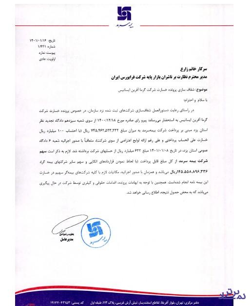 بر این اساس، این شرکت اعلام کرد، در خصوص خسارت شرکت گرماآفرین ایساتیس در تاریخ ۱۴۰۱/۰۱/۰۸ مبلغ ۶۳۲ میلیارد ریال از حسابهای شرکت برداشته شد که سهم شرکت از کل مبلغ قابل پرداخت ۱۴۵.۵۵۸.۸۹۶.۳۳۶ ریال است.