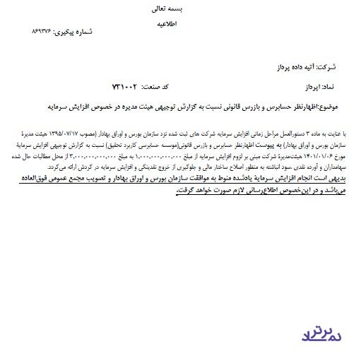 به گزارش نماد برتر- شرکت آتیه داده پرداز از ظهارنظر حسابرس و بازرس قانونی نسبت به گزارش توجیهی هیئت مدیره در خصوص افزایش سرمایه خبر داد.