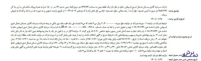 بر این اساس، این شرکت اعلام کرد، مزایده فروش یک قطعه زمین به مساحت ۹۶۹۹.۴۴ متر مربع (ابعاد زمین حدود ۶۴ متر در ۱۵۰ متر) با زیر بنا کل ۴۸۵۱۷.۲۴ متر مربع به آدرس مشهد: بلوار آیت ا... رفسنجانی، بلوار عصمتیه، اراضی باغ عامل زاده برگزار، اما فاقد شرکت کننده بود.