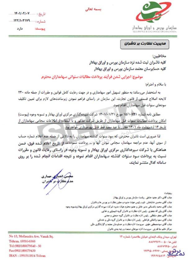 بر این اساس تمامی ناشرانی که سود سنوات گذشته سهامداران را به دلایل مختلف از جمله عدم اعلام شماره حساب سهامدار، عدم مراجعه سهامدار به بانک، سجامی نبودن و سایر موارد پرداخت نکردند، باید از تاریخ اعلام شده فوق با هماهنگی سمات نسبت به پراخت سود سنوات گذشته سهامداران اقدام کنند و نتیجه اقدامات را در سامانه کدال منتشر کنند.
